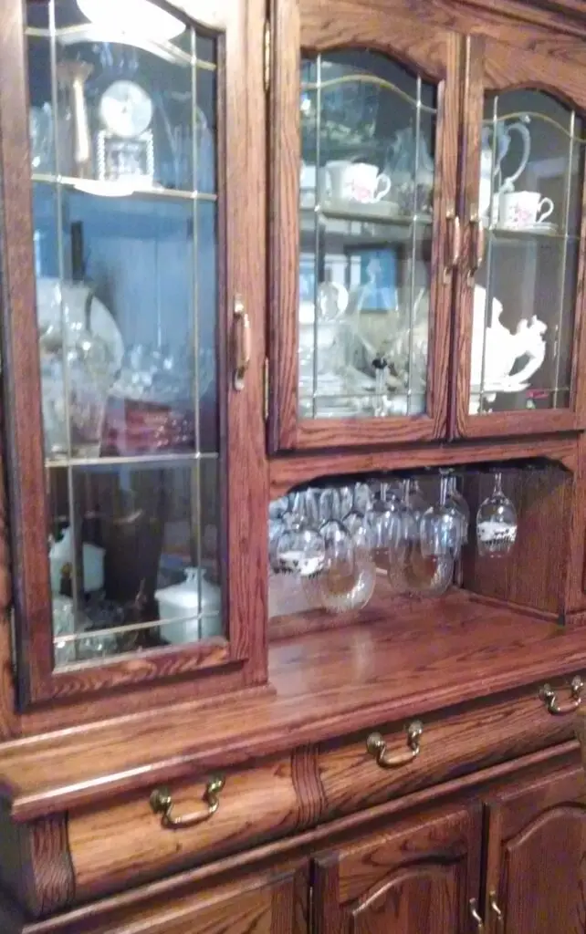 The rest of the three sections on top of this monster that required two grunting men to move includes little odds and ends that came from a lifetime of collecting and inheriting. This piece has unique slats in the middle to slide in wine glasses, which tinkle sweetly against each other when some Big Foot stomps by.
